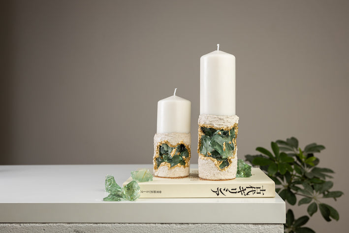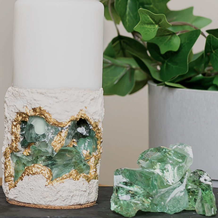 Our Duo Set of Concrete Candles with Green Crushed Glass – where nature meets modern design. Illuminate your space with a touch of freshness and contemporary elegance.