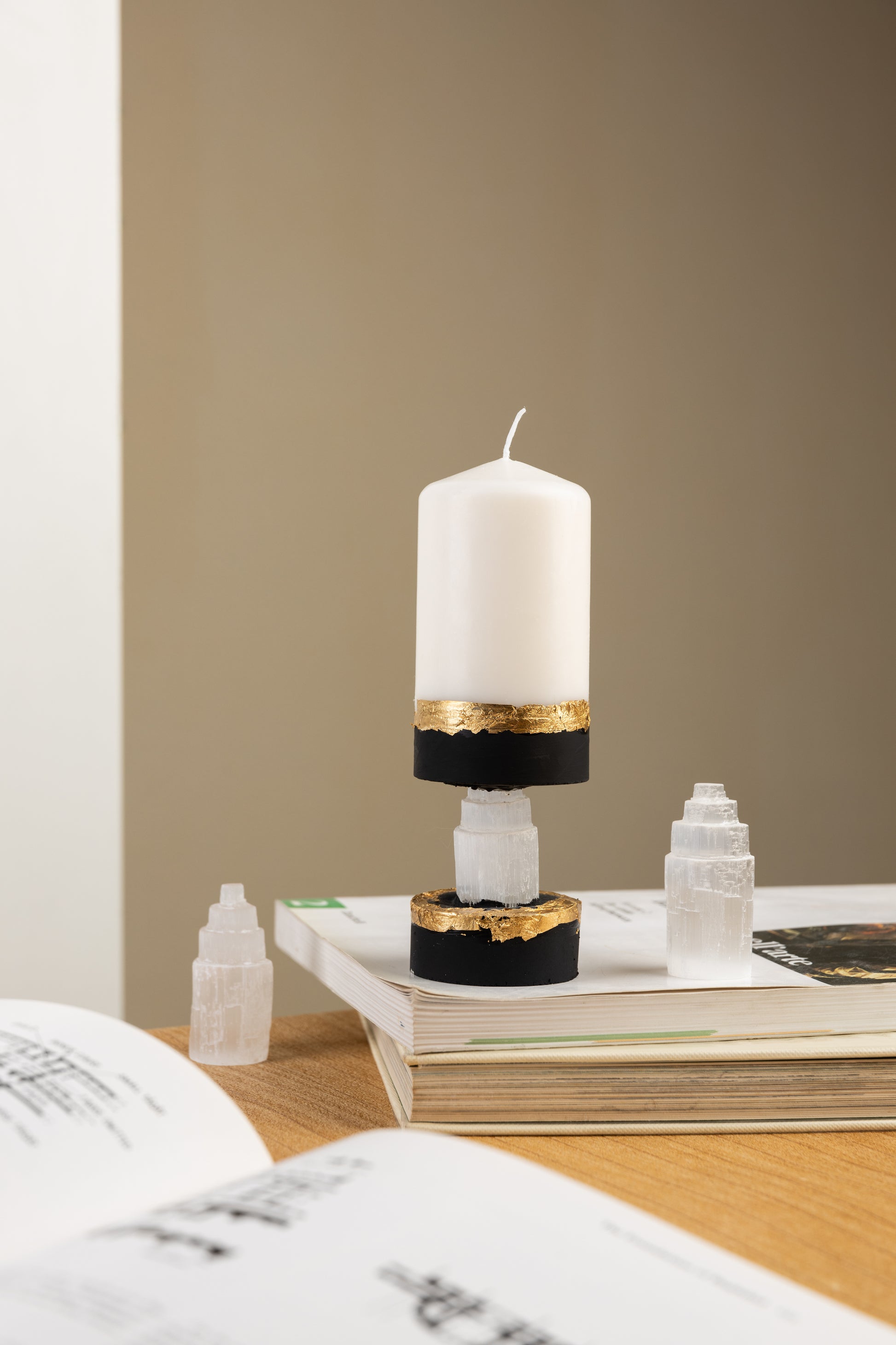 Selenite Sculpt, a captivating decorative candle crafted from a remarkable selenite rough tower. This unique masterpiece marries the innate allure of selenite with artistic design, creating a centerpiece that radiates ethereal beauty and tranquility, all while illuminating your space.